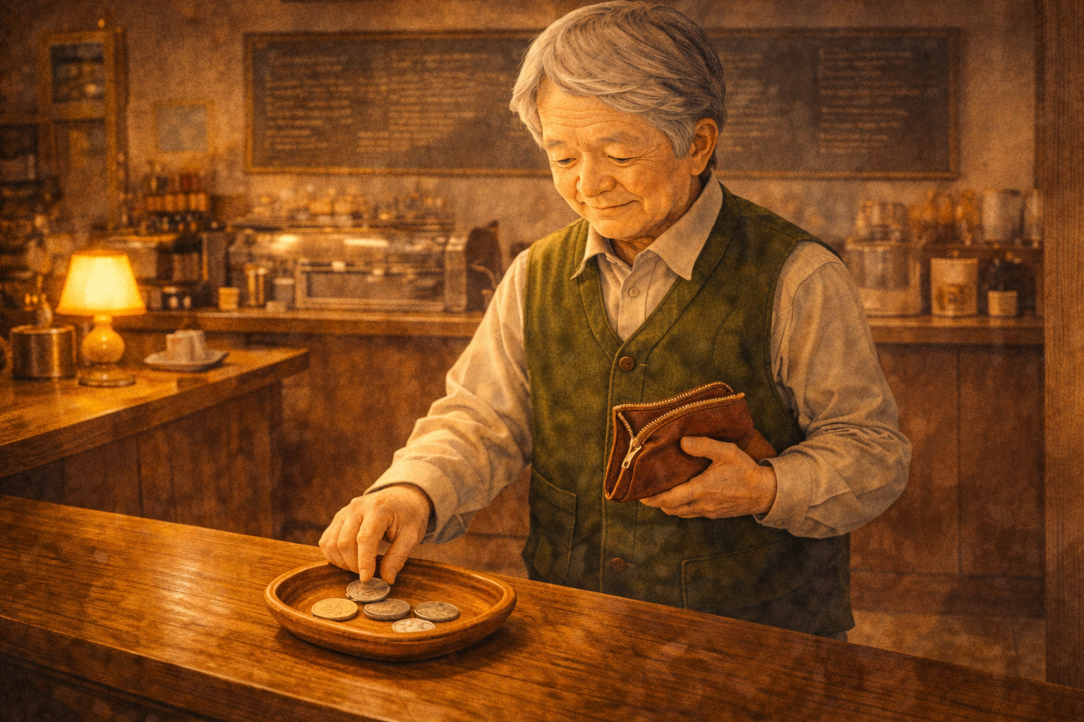 低い音が、木のカウンターに静かに広がる。