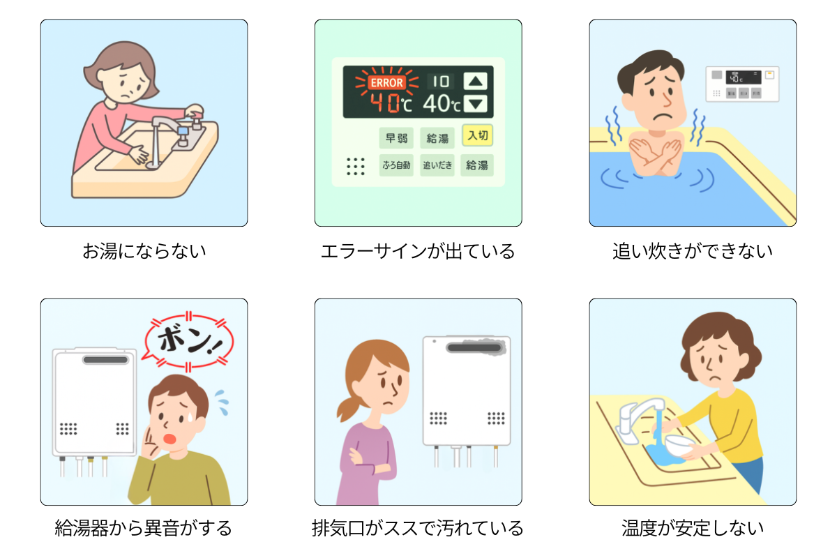 「お湯の温度が安定しない」「変な音がする」「リモコンにエラー表示が出る」などのサインがあれば、