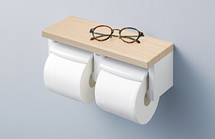 紙巻器は棚付きのタイプを選びました。小物が置けたり、手をついてちょっとした手すり替わりに使うこともできます。構造用合板を張った壁なので強度もしっかりしています。